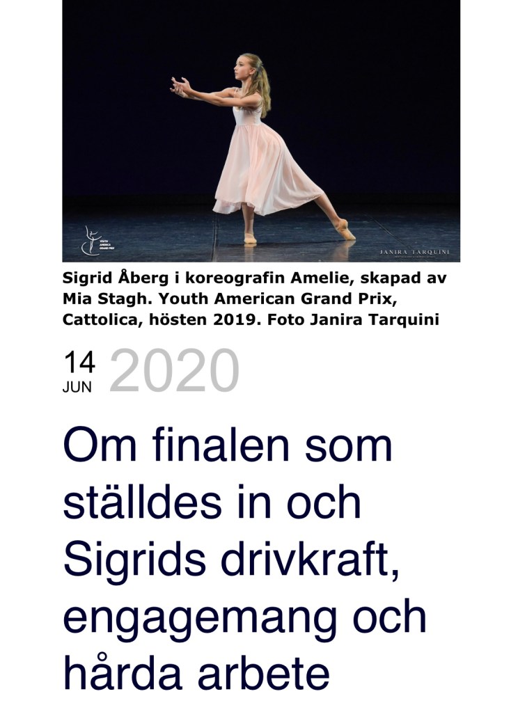 Men nu är det dags för en text. Jag tipsade en person om bloggen och fick lust att göra ett inlägg. Insåg nämligen att jag inte skrivit om det väldigt fina porträtt Dansportalen gjorde av Sigrid i våras. Då hade corona precis slagit till, New York var inställt och allt var vänt upp och ner. Artikeln kom inte ut förrän i Juni men är väldigt glad för hur de fångade Sigrid och hennes tankar om dans, tävlingen i New York och Alhanko Academy of Ballet.